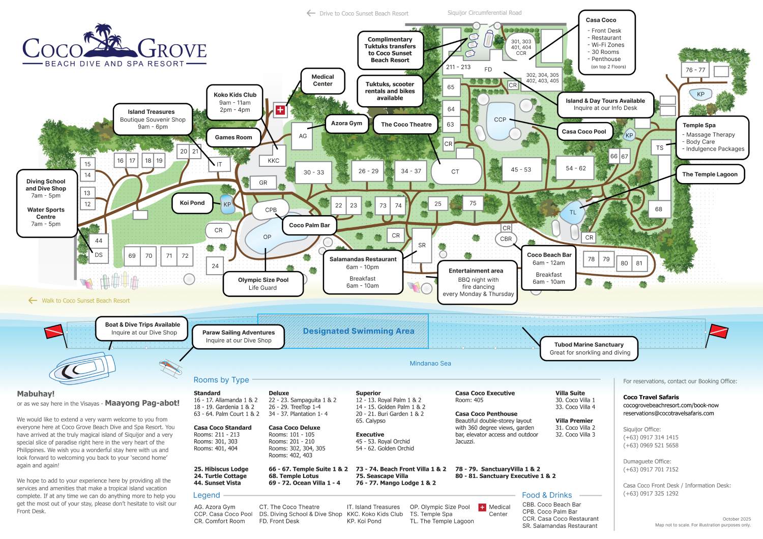 Our illustrated resort map gives you an idea of the size of the resort and also the location of rooms, shops, guest services, attractions, operating times and it’s 800m beachfrontage.